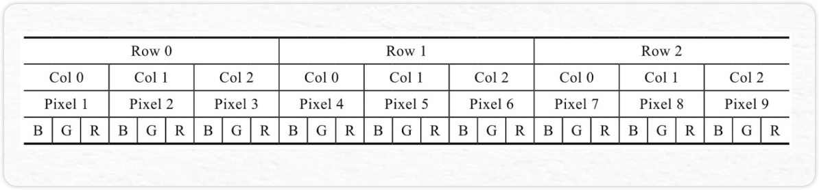 图像中的每个点都称为像素,每个像素可以存储一个或多个值,这取决于它是是否仅存储一个值的黑白图像,还是存储两个值的灰度图像,或者是存储三个值的彩色图像 BGR图像在内存中的存储格式: